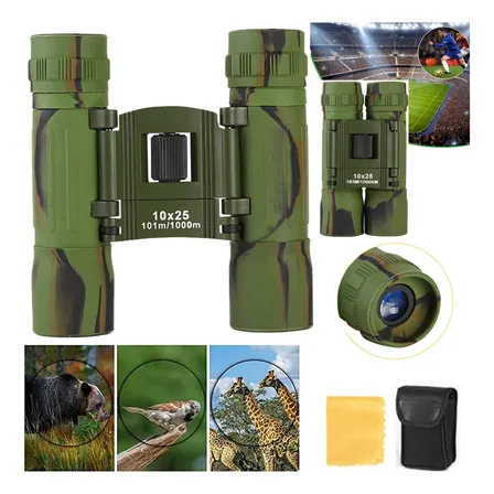 Explore o mundo com o Binóculos 10×25 de Alta Potência! 🔭 Visão nítida e ampliada para esportes, natureza e aventura. Design camuflado verde, compacto e portátil. Perfeito para observação de aves, eventos e paisagens. Leve o seu agora! ✨