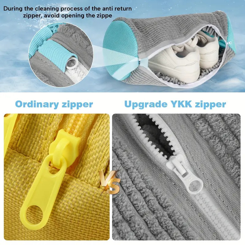 Lave seus calçados com segurança e praticidade! Esta bolsa protetora de 390x190mm, em tecido macio cinza com tela azul, possui zíper YKK robusto para evitar aberturas. Proteja tênis e sapatos de danos e deformações na máquina, mantendo-os impecáveis por mais tempo. Essencial para sua lavanderia!