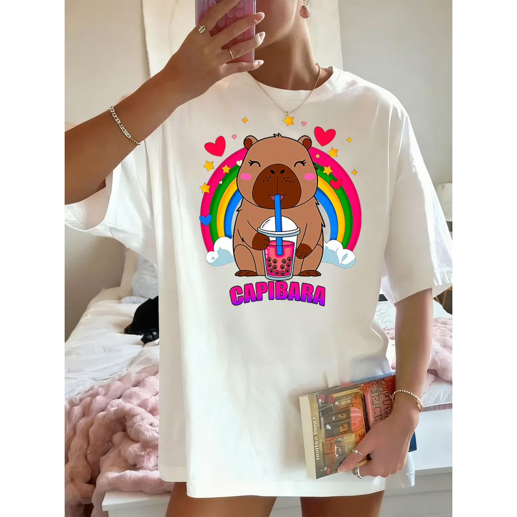 Aproveite a liquidação! ✨ Camiseta feminina oversized com estampa divertida de Capivara tomando Bubble Tea e arco-íris. Perfeita para um look casual e cheio de estilo. Conforto e moda em uma peça só! 💖 Garanta já a sua e arrase! 🛍️