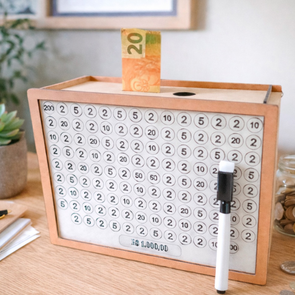 Cofre Desafio Financeiro Personalizado MDF com Caneta | Metas de 1K, 5K, 10K | Organize e Economize!