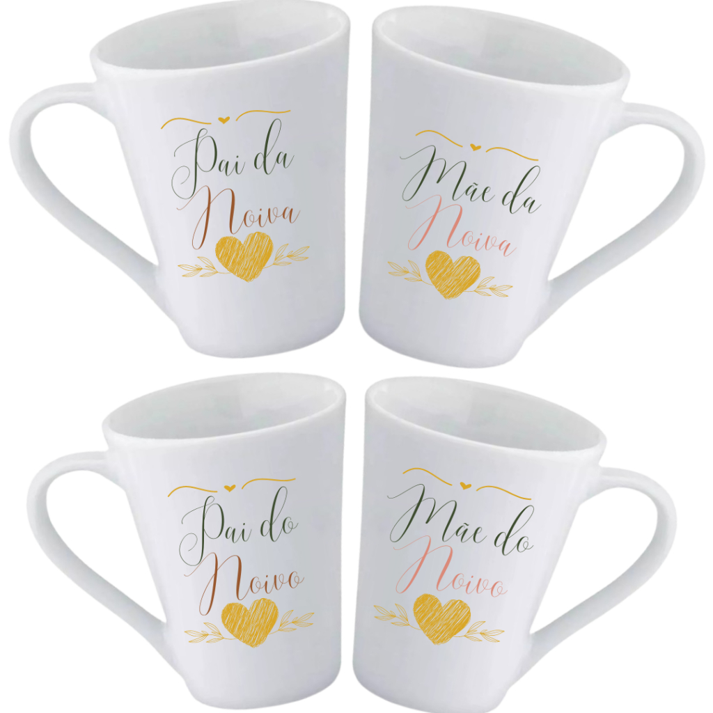 Jogo 4 Canecas Tarsila personalizadas para pais dos noivos! 💖 Presenteie com carinho e originalidade padrinhos e madrinhas. Ideal para casamentos, eternize momentos especiais com esta lembrança única. Surpreenda quem você ama! ✨🎁