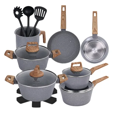 Transforme sua cozinha! 🍳 Jogo de Panelas 15 Peças em Cerâmica Antiaderente, cor Cinza. Compatível com Gás e Indução. Cozinhe com estilo e praticidade. Alimentos não grudam, limpeza fácil! ✨ Design moderno com cabos amadeirados. Perfeito para o dia a dia! 🧑🍳