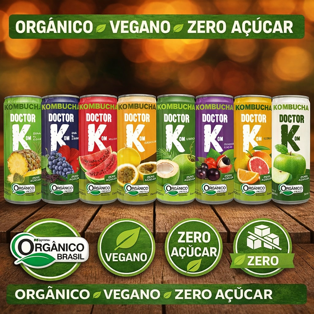 Experimente a Kombucha Doctor K! 🌿 Orgânica, vegana, zero açúcar e zero álcool. Uma bebida refrescante e saudável para o seu dia a dia. Diversos sabores em 350ml. Sinta o bem-estar! ✨