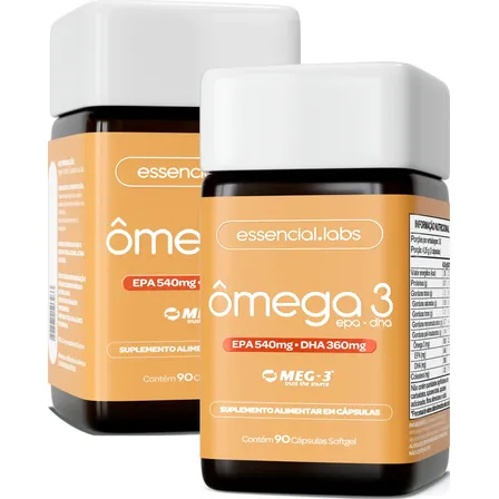 Garanta sua saúde com Ômega 3 Essencial Labs! 💪 2 potes de EPA DHA Meg-3® 1000mg, sem sabor. Essencial para coração, cérebro e bem-estar. Não perca essa oferta exclusiva! ✨