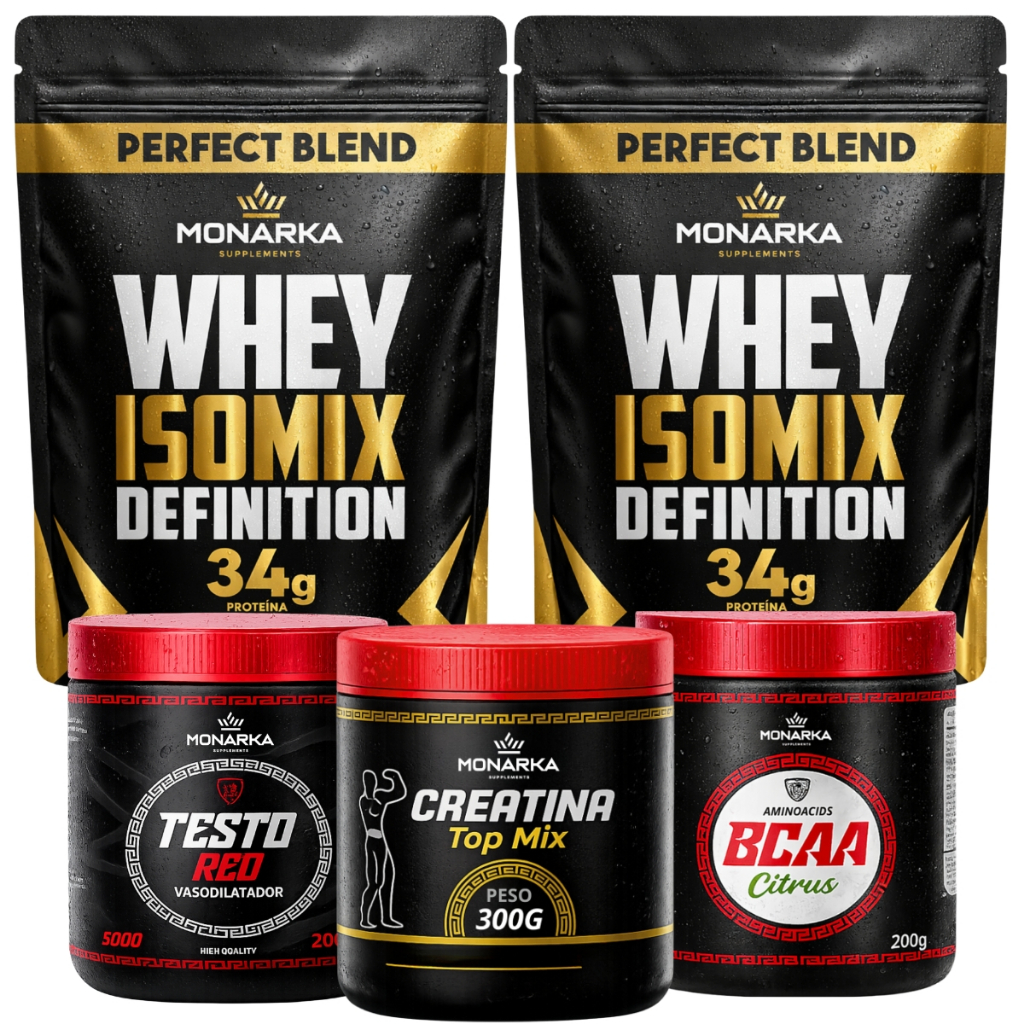 Maximize seus resultados com o KIT completo Monarka! 💪 2 Whey Protein Isolado Concentrado para definição, Creatina para força, BCAA para recuperação e Testo Red para performance. Alcance seu shape ideal! ✨ Suplementos essenciais para seu treino. Garanta já! 🚀