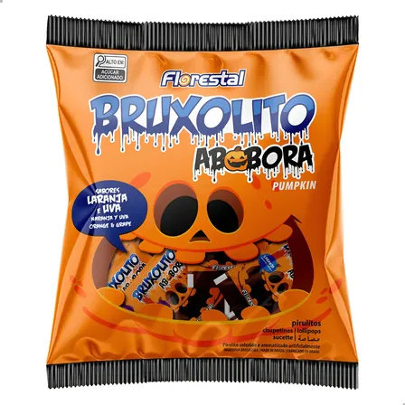 Delicie-se com o Pirulito Florestal Bruxolito! 🎃 Sabores laranja e uva, perfeitos para festas e sem glúten! 🍬 Pacote com 50 unidades para a diversão não ter fim. Garanta já o seu! 🎉