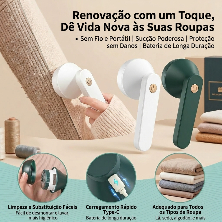 Dê vida nova às suas roupas! ✨ Nosso removedor de pelos e bolinhas é sem fio, portátil e com sucção poderosa. Protege seus tecidos, tem bateria de longa duração e carregamento Type-C. Fácil de limpar e serve para todos os tipos de roupa. Tenha peças impecáveis sempre! 👕👖